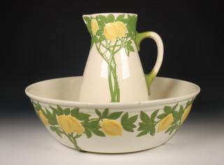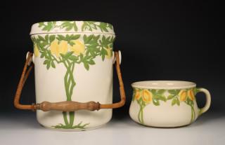 Bestaande uit waskom en kan. Hierbij twee kannen, po en emmer. (waskom met haarscheuren).