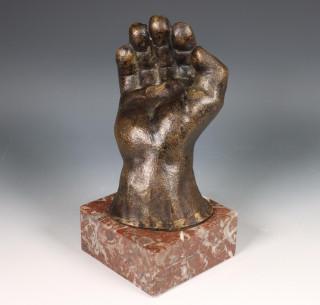 Bronzen sculptuur van hand op rood marmeren vierkante voet.