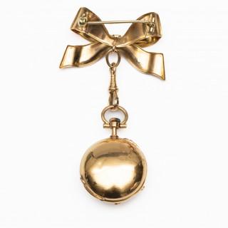 France, 18 k. gold ladies remontoir watch, with a gold inner lid. On a gold bow brooch.