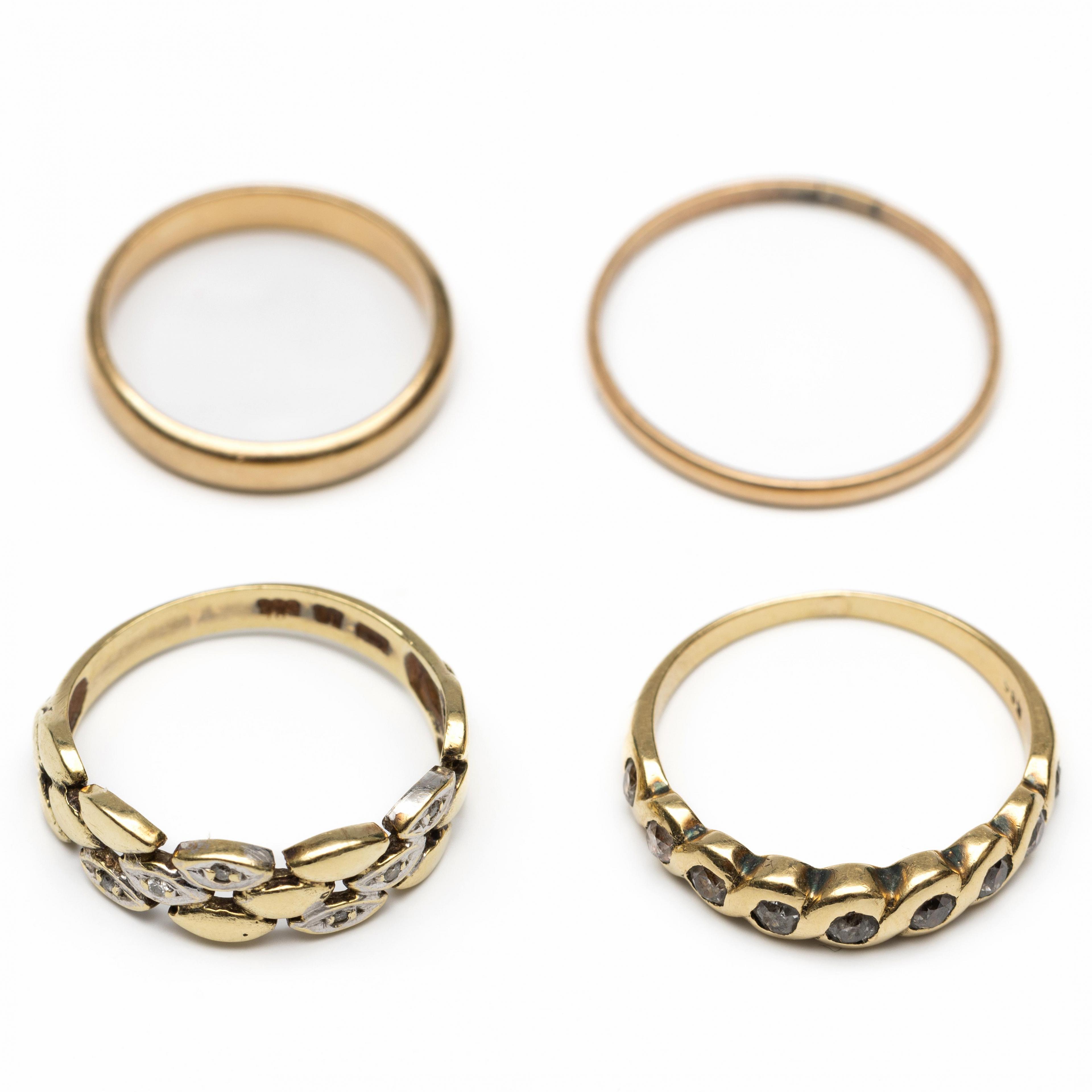 Two gold rings, both set with brilliant cut diamonds, approx. 0.35 ct in total. Includes two wedding rings