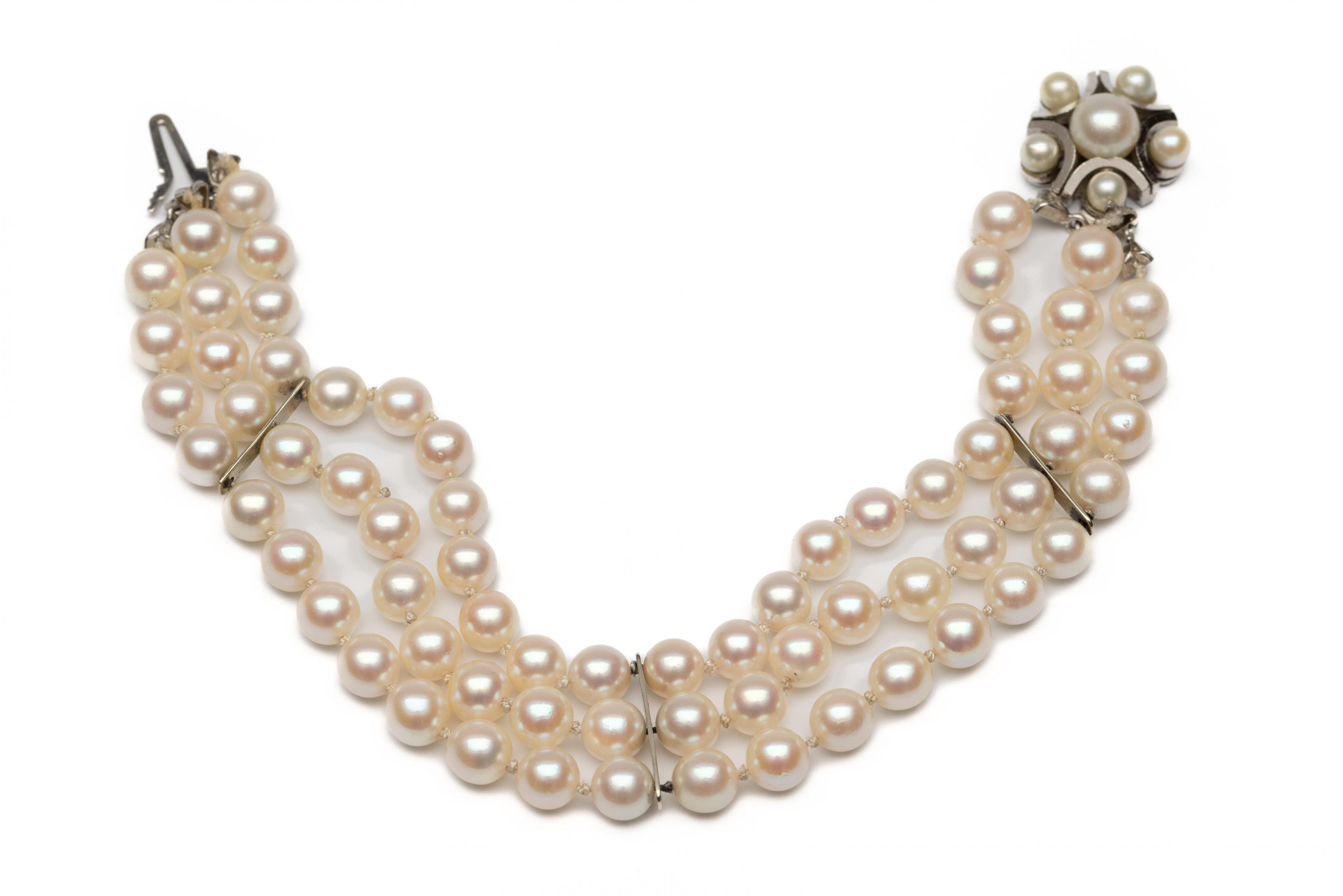 bestaande uit drie rijen. Aan een 14 kt. witgouden sluiting, bezet met parels