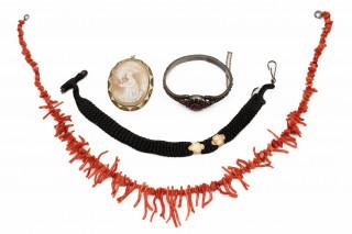 A collection of antique jewellery, including a tombak bracelet with Bohemian garnet.