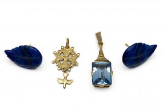 A pair of below legal gold alloy stud earrings, each with a cut lapis lazuli leaf. Hereby two 14 k. gold pendants, one Huguenot cross and one with synthetic blue spinel