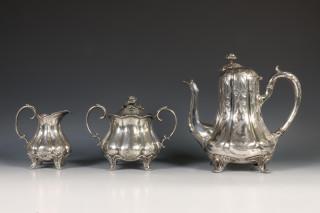 rond model, bestaande uit theepot, melkkan en suikerpot, versierd met graveringen van acanthusbladmotieven, bloemvormige knop scharnierende, gemerkt en genummerd