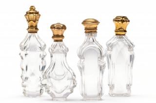 Vier kristallen parfumflacons met gouden montuur, 19e eeuw.