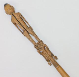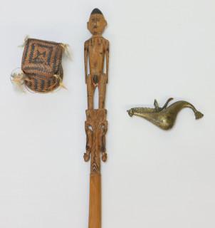 Sentani Meer staf, India, messing kruithoorn en een Zuid Amerikaans gevlochten mandje.