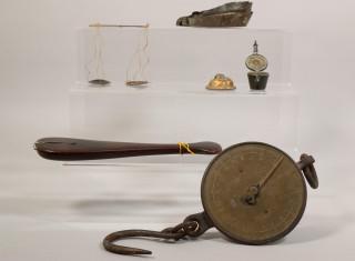 Divers weeg-gerei; Engeland, muurweegschaal en nestgewichtjes (incompleet), China, opiumweegschaal.