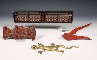 zijdeklos, naaldtrektang, tang, en presse-papier in de vorm van hagedis