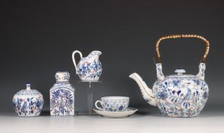 Bestaande uit theepot, filter, mengkom, suikerpot en melkkan. Hierbij porseleinen theeservies Zwiebelmuster decor bestaande uit theepot, kop en schotel, suikerpot, melkkan en theebus.