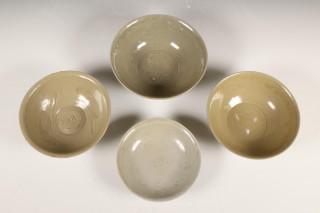 China, four celadon glazed bowls, Northern Sung dynasty, 10th-12th century, two with combed stylised floral decoration, two even, covered with varying tones of greyish-green glaze (condition: glaze crackled, light wear due to exposure to sea-water)