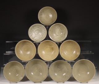China, ten celadon glazed bowls, Northern Sung dynasty, 10th-12th century, with stylised floral and combed decoration, covered with varying tones of greyish-green glaze (condition: some small chips, light wear due to exposure to sea-water)