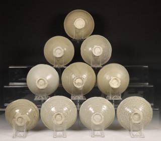 China, ten celadon glazed bowls, Northern Sung dynasty, 10th-12th century, with flowing floral decoration, covered with varying tones of greyish-green glaze (condition: some small chips, light wear due to exposure to sea-water)