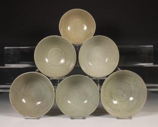 China, six deep celadon glazed bowls, Northern Sung dynasty, 10th-12th century, with flowing floral decoration, covered with varying tones of sea-green glaze (condition: some small chips, light wear due to exposure to sea-water)