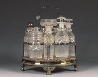 Kristallen geslepen olie en azijn stel in verzilverde houder, ca. 1900;