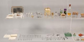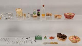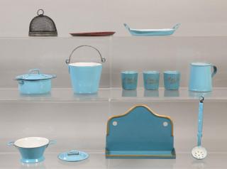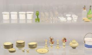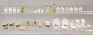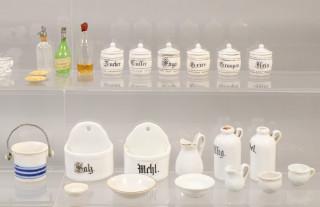 Diverse antieke poppenhuis eetkamer en keuken attributen, ca. 1900;