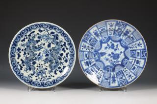 China, blue and white porcelain 'kraak'-style plate, 20th century, decorated in the Wanli-style with central panel surrounded by panels of antiquities and flowers, together with a Japanese plate painted with dragons (condition: in good overall condition)