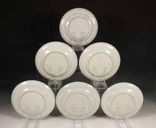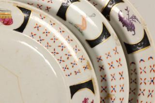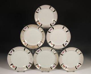 bestaande uit een set van zes exportborden gedecoreerd met wapenschilden en een bord gedecoreerd met bloemenmand (slijtage)