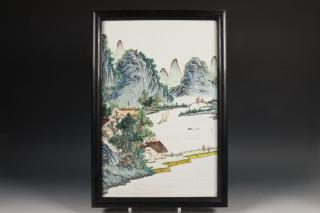China, famille verte porcelain tile, 20th century, painted with a mountainous river landscape, framed (condition: in good overall condition)