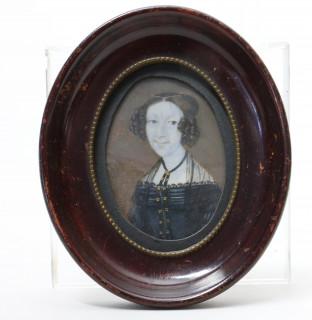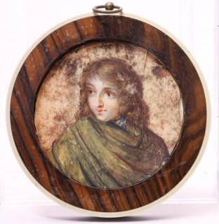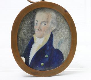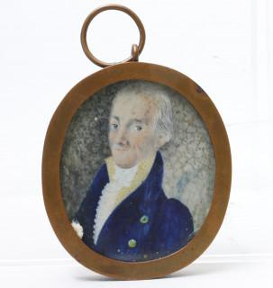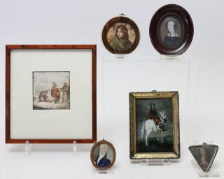 Vier miniatuur portretten, een achterglasschildering van een ruiter te paard en een ingelijst prentje, 18-19e eeuw.