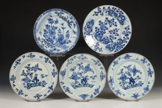 China, collection of blue and white porcelain plates, 18th century, comprising a set of three and two single plates, all painted with flowers (condition: the largest single plate with a hairline, two of the set of four with a rim chip)