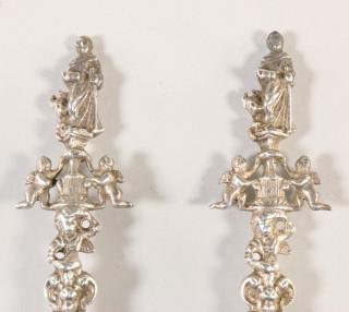 bekroond door evangelist Lucas, versierd met putti e.a. motieven, verso bak met versierde gravure en tekst "Pieter Ates lovenswaardig boven alles 1720", valse keuren, 2e gehalte
