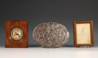 bestaande uit een schildering op been van een sultan, ingelijst, een tekening op papier, ingelijst en een ijzeren plaque met gevechtsscène (kleine beschadigingen)
