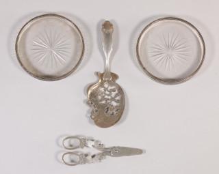 Druivenschaar, natfruitschep en paar kristallen flessenbakken met zilveren montuur, vroeg 20e eeuw,