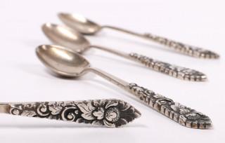 alle met bloemversiering in reliëf, zes dinercouverts mt. J.M van Kempen Voorschoten, zes desert couverts (éen lepel ontbreekt ) en vier theelepels, Djokja mt. MM,