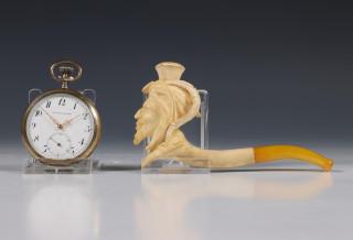 Binnendeksel met inscriptie: 'C.J. Kuipers ter herinnering aan uw leertijd aan de fabriek van Appendages voor Machines en Stoomketels van G. Dikkers en Co Hengelo'. Compleet met garantiebewijs. Hierbij meerschuim pijp gesneden in de vorm van een nar. In etui.