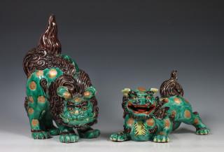 Japan, two Sancai-glazed and gilt porcelain buddhist lions, 20th century,