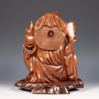 in seated position and holding up a pearl for a dragon by his side, on wood stand (some cracks to the wood)