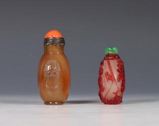 one carved in red overlay with lotus, the other in imitation of stone and with two mask-and-ring handles, stoppers