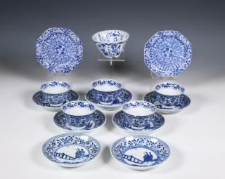 Bestaande uit negen schotels en zes kommen. Uitgevoerd met transferprint.