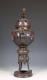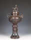 on tripod stand, the bulbous vessel moulded with birds and flowers, applied with two lion handles, the openworked cover surmounted by a lion finial (wear)