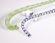 Een uitgevoerd in groen glas met witte opgelegde glasdraad, de ander helder glas met blauw en rode ingeloten slinger en opgelegde witte slinger.