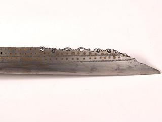 fine steel blade inlaid with copper dots, the upper part towards the tip with welded pattern. Piso raut, wooden scabbard, partly with carved design. The hilt with pierced intricate deer horn pommel