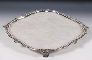 op vier gebogen pootjes, de rand met bloemmoetieven, mt. Hendrik Swierink, Amsterdam, 1768, ook gekeurd met gekroonde V (licht gedeukt)