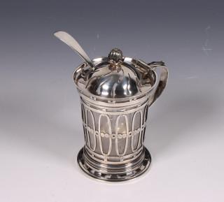 met opengezaagde zijden, de deksel bekroond door vrucht, met glazen binnenbakje, mt. aambeeld (Voet, 508, Amsterdam, 1780, met glazen binnenbakje en daarbij een ongekeurd lepeltje