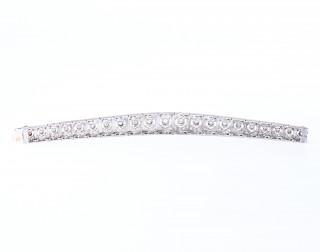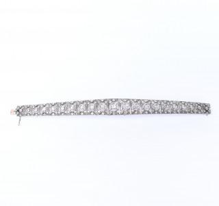 opgebouwd uit rechthoekige schakels, in breedte aflopend vanuit het midden. Elke schakel in het midden bezet met een oud briljant geslepen diamant (totaal ca. 1.50 ct.) en zes roosgeslepen diamanten.