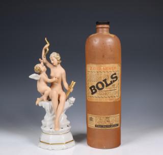 Bols fles met speeldoos, speelgoed heftruck met originele verpakking en porseleinen vormstuk West Duitsland.