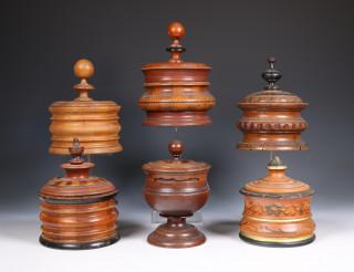 zes houten tabakspotten, 19e/20e eeuw;