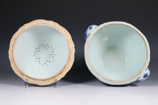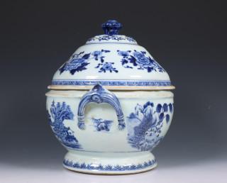 the circular tureen decorated with willows and pavilions in a river-landscape, the domed cover with pierced top part and painted with flowers