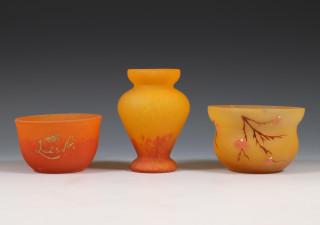 Twee oranje verre Francais schalen en vaasje, Art Nouveau stijl;