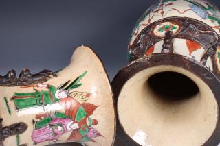 decorated with warrior scenes, each with moulded chilong on the shoulder and lion handles (one neck restored, rim crack and small damages)