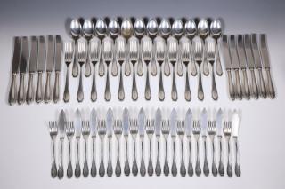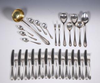 uiteinde steel met voluutvormen versierd en lettermonogram B, bestaande uit twaalf dinercouverts, twaalf viscouverts, twaalf dessertvorken, zes kleine lepels, soepopdienlepel en zeven diverse opdienlepels en vorken, twaalf dinermessen en twaalfdessert messen, mt. Bremer Silberwarenfabrik Bremen 1905-1981, 800ste,