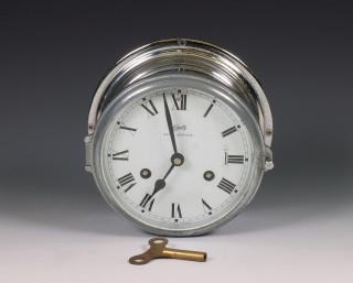 Schatz, glazen slaande scheepsklok in nikkelen kast, ca. 1960.