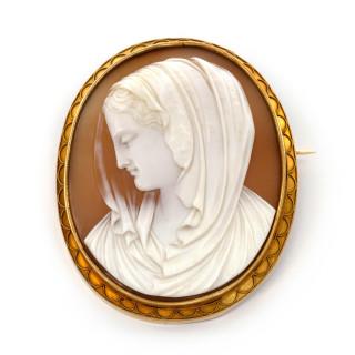 14 k. Gold brooch with a shell cameo, ca. 1900. With a portrait of a lady with a veil.
