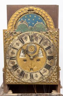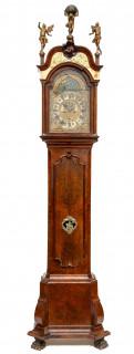 Uurwerk uitgevoerd met gaand, slagwerk en speelwerk op bellen. Deels verzilverde en verguld koperen wijzererplaat met aanduiding van dag, datum, maand, seconde en maanstand. Eikenhouten kast opgelegd met noten- wortelnoten, gestoken houten klauwpoten. Binnenzijde deur met handgeschreven register voor muziek. De kap met verre eglomise panelen met decoratie van leeuwen, ruiten en vazen. Compleet met beelden, slinger en drie gewichten. (kast en uurwerk in te restaureren staat).