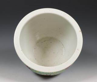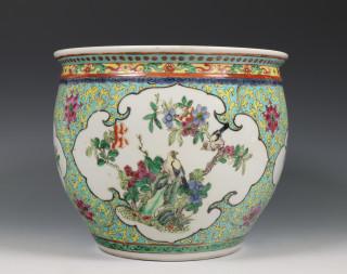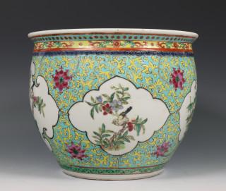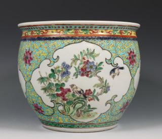 decorated all around with cartouches of birds in branches of peony, bamboo and prunus, on a turquoise ground embellished with flower scrolls