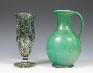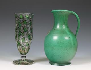 Uitgevoerd met geometrisch medaillon, (ongemerkt) Hierbij glazen vaas met emaille verf decoratie van bladeren, mogelijk A. J. van Kooten. (rand kan met twee schilfers).